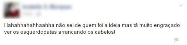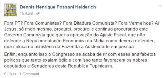 "O objetivo desse evento era formar a militância virtual para apoiar o governo petista. Quando acabou a eleição, não mexi mais no evento. Quando comecei a postar novamente, já foram coisas na linha do 'Fora PT'", diz.