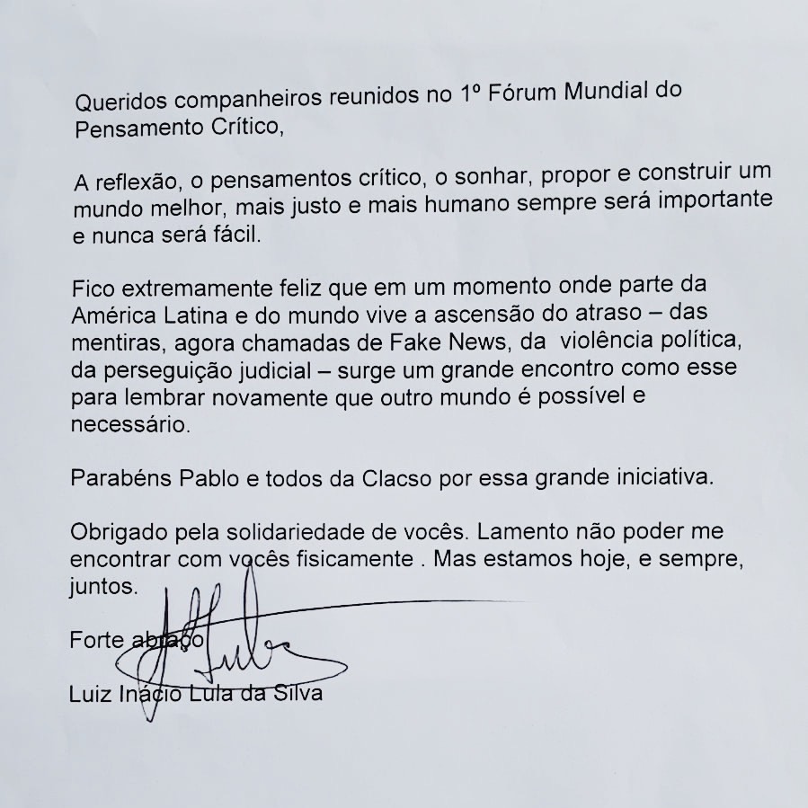 O ex-presidente Luiz Inácio Lula da Silva enviou nesta quarta-feira (21) uma carta ao 1º Fórum Mundial do Pensamento Crítico promovido pelo Clacso (Conselho Latino-americano de Ciências Sociais). “Fico extremamente feliz que em um momento onde parte da América Latina e do mundo vive a ascensão do atraso – das mentiras, agora chamadas de Fake News, da violência política, da perseguição judicial – surge um grande encontro como esse para lembrar novamente que outro mundo é possível e necessário”, escreveu Lula.