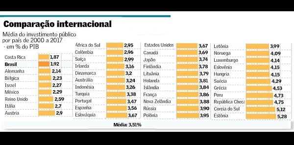 O Valor publica hoje esta tabela elaborada com dados do Observatório de Política Fiscal do Instituto Brasileiro de Economia da Fundação Getulio Vargas (Ibre/FGV), onde o Brasil ostenta a nada animadora penúltima posição em investimento público numa amostra de 42 países, em matéria de investimentos públicos, entre 2000 e 2017, periodo que claro, engloba todos os governos petistas.