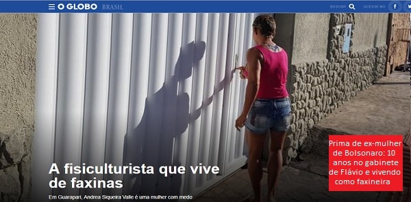 Juliana Dal Piva, em O Globo, publica hoje um extenso relato da vida da família Valle, da qual faz parte Ana Cristina Siqueira Valle, ex-mulher do presidente Jair Bolsonaro. Não teriam interesse algum se a família Valle não tivesse nove parentes contratatados no gabinete dele e de Flávio Bolsonaro, no período em que este foi deputado estadual na Assembleia Legislativa do Rio de Janeiro.