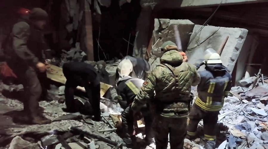 Uma captura de tela de vídeo divulgada pelo Ministério de Situações de Emergência da Rússia mostra equipes de resgate trabalhando em um local do bombardeio na cidade de Lysychansk, na região de Lugansk, em 3 de fevereiro de 2024. (Xinhua)