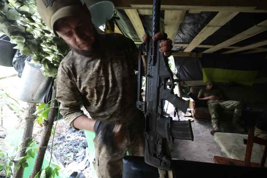 Um soldado do batalhão de rifle motorizado da 93ª brigada mostra uma espingarda anti-drone em um local em Donetsk em 15 de agosto de 2024. (Foto por Peter Druk/Xinhua)