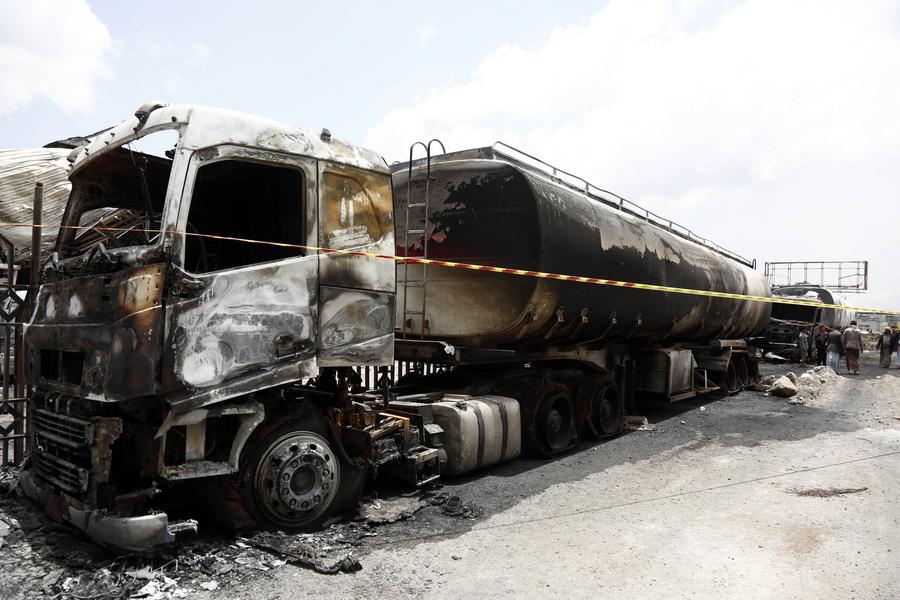 Petroleiro destruído após ser atingido por ataques aéreos israelenses no domingo, em Sanaa, Iêmen, em 25 de agosto de 2025. (Foto por Mohammed Mohammed/Xinhua)