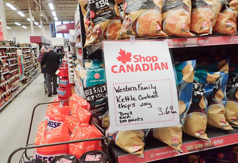 Placa com escrita "Compre Produtos Canadenses" em supermercado em Vancouver, British Columbia, Canadá, no dia 4 de março de 2025. (Foto por Liang Sen/Xinhua)