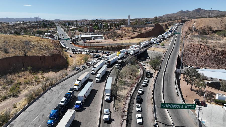 Foto aérea de drone mostra caminhão-reboque (canto inferior esquerdo) transportando veículos em uma rodovia em Nogales, Sonora, México, no dia 2 de abril de 2025. (Xinhua/Li Mengxin)